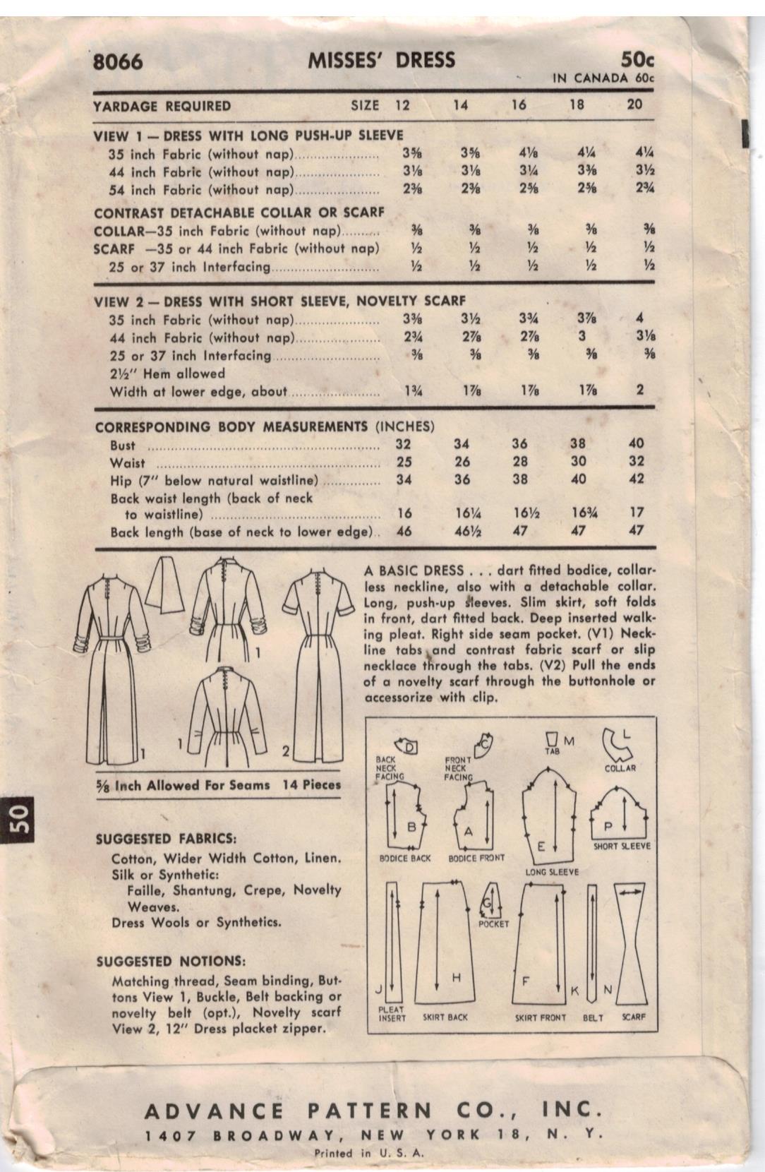 Advance Pattern 8066 Vintage Misses Sheath Dresses With Neckline And Sleeve Variations Size 16 Bust 36 Sewing Pattern Heaven